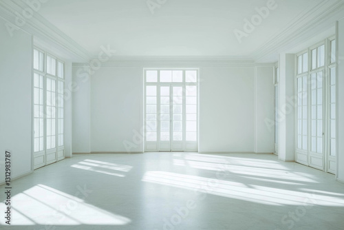 Sunlight streams through expansive windows in a minimalistic interior, creating gentle shadows on the white floor and brightening the tranquil atmosphere