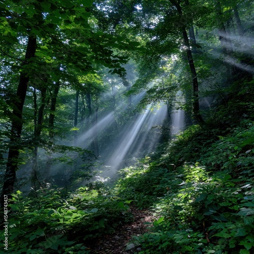 Sunlight streams through lush forest