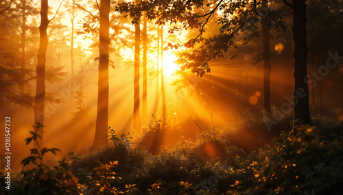 sunlight streams through trees, creating a mesmerizing scene. The sun rays illuminate the forest