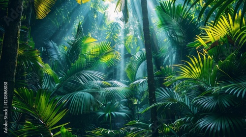 Sunlight through lush tropical leaves, green and blue tones. AI generative. .