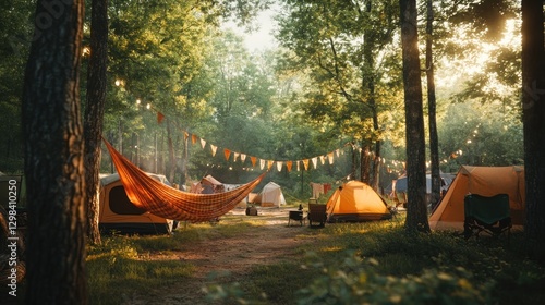 Sunlit campsite in a forest with tents, hammocks, and string lights.