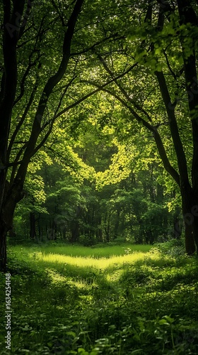 Sunlit clearing in a lush green forest with dappled light and arching trees woods nature