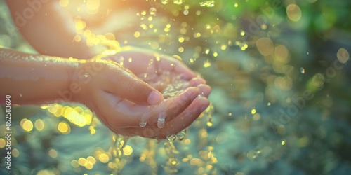 Sunlit droplets of water splash around hands cupping the fresh water