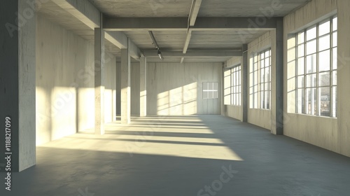 Sunlit empty industrial loft space with concrete walls and large windows.