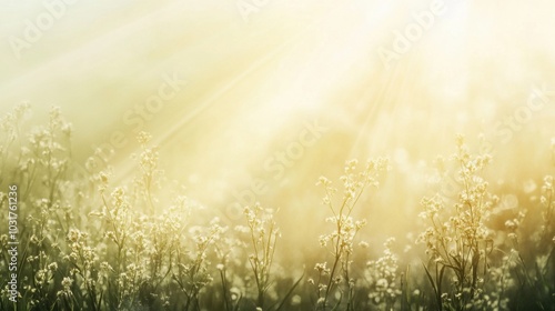Sunlit field of flowers with gentle fog creating a serene atmosphere