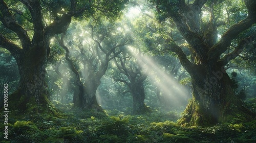 Sunlit Forest: Ancient Trees, Lush Greenery