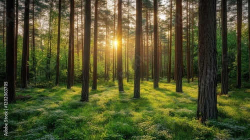 Sunlit Forest Path: Golden sunlight streams through tall pine trees, illuminating a tranquil forest floor carpeted with vibrant green moss and wildflowers.