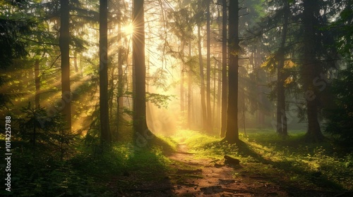 Sunlit Forest Path in Lush Tranquil Wilderness