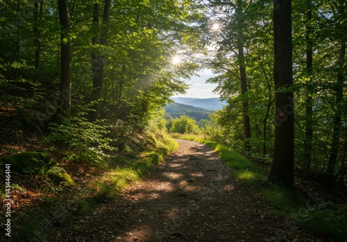 Sunlit Forest Path Leading Through Lush Green Trees