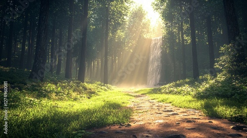 Sunlit Forest Path to Waterfall Nature Tranquility Green Trees Scenic