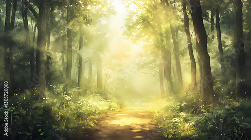 Sunlit forest path: watercolor painting of serene woodland scene. Ethereal - Clouds. Illustration