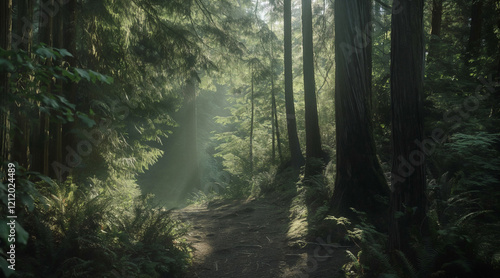 Sunlit Forest Path with Whispered Secrets Theme of Tranquility and Mystery