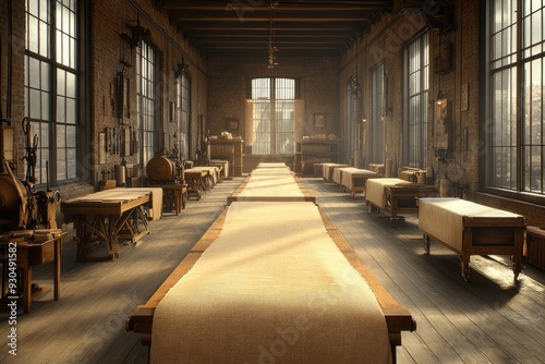 Sunlit Industrial Workspace with Long Tables and Fabric Rolls
