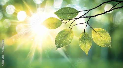 Sunlit leaves, spring branch, forest bokeh, nature serenity; website banner