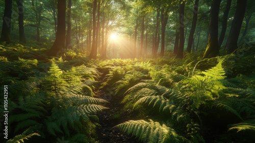 Sunlit lush green forest clearing with soft morning light, perfect for tranquil nature visuals
