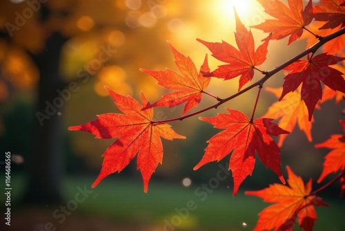 Sunlit maple branch displays fiery hues; leaves in various stages of autumn color change , outdoors, park