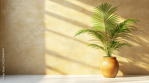 Sunlit minimalist interior with lush green palm leaves in a ceramic vase casting shadows on a textured beige wall, perfect for design inspiration, home decor themes, and nature-inspired artwork