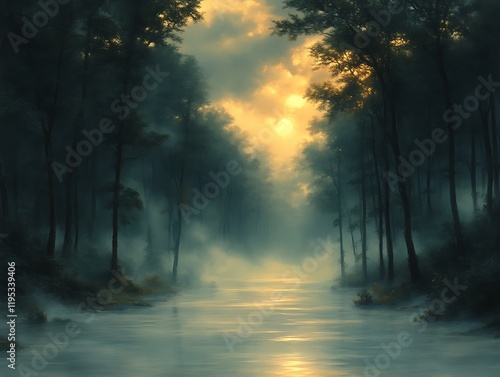 Sunlit mist-shrouded forest path reflecting in calm water.