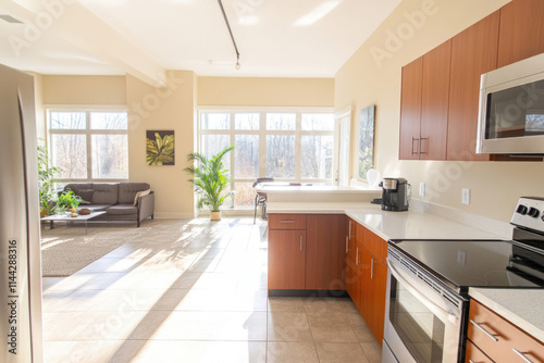 Sunlit modern apartment showcasing open-plan living and kitchen with hardwood floors and large windows.