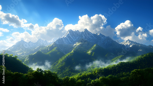 Sunlit Mountain Range with Lush Green Valley and Blue Sky