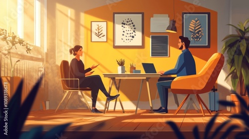 Sunlit Office Meeting: A Collaborative Discussion Between Two Colleagues in a Modern Workspace