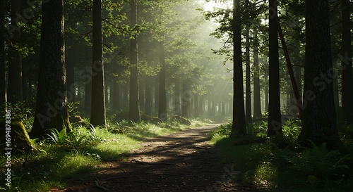 Sunlit path through a dense forest, with tall trees and dappled sunlight creating a serene atmosphere.