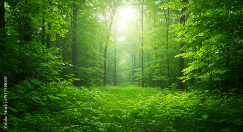 Sunlit path through a lush, vibrant green forest, showcasing dense foliage and dappled light.