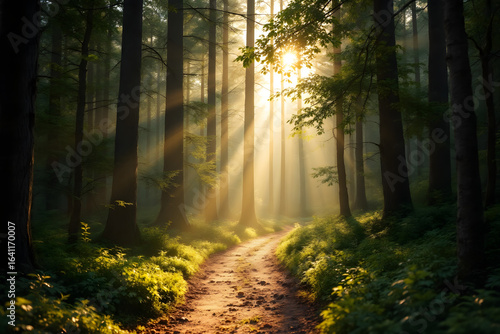 Sunlit Path Through a Mystical Forest Morning Glow Nature Escape