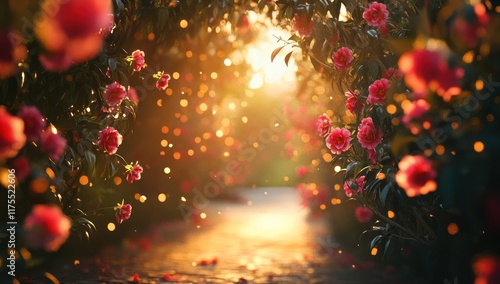 Sunlit path through blooming rose archway.