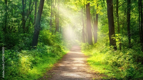 Sunlit path through lush green forest.