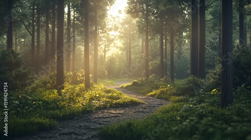 Sunlit path winding through a misty forest with tall trees and lush greenery.