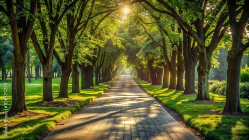 Sunlit Pathway Through Lush Green Tree Lined Avenue