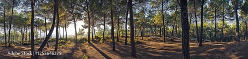 Sunlit pine forest panorama, showcasing tall trees, shadows, and a tranquil atmosphere.