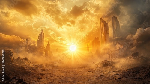 Sunlit ruins of a deserted city in a vast, dusty landscape.