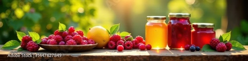 Sunlit rustic table displays assorted jam jars & fresh berries , red, cherry, wooden table