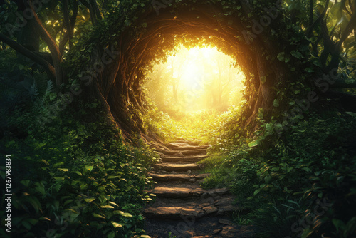 Sunlit stone steps lead through a mystical, overgrown tunnel in a lush, vibrant forest, promising adventure.