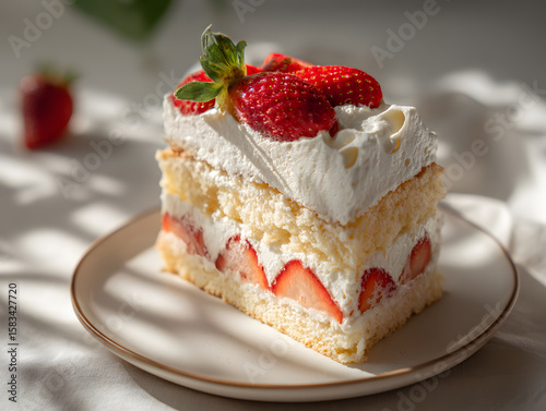 Sunlit Strawberry Shortcake Slice: Delicate Layers Creamy Whipped Topping.