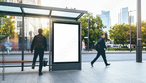 Sunlit Urban Bus Stop with Blank Billboard Mockup and Pedestrians in Motion.