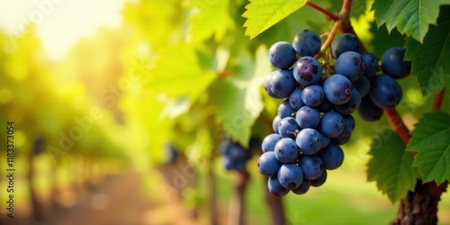 Sunlit Vineyard A Cluster of Ripe Dark Grapes Hanging on the Vine