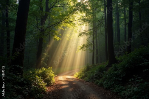 Sunlit Winding Path in a Mystical Forest