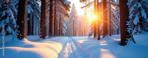 Sunlit winter forest panorama, snow-covered trees and ground, image, sparkle, trees