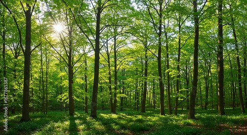Sunlit Woodland Canopy: A Serene Forest Landscape with Lush Green Foliage Illuminating the