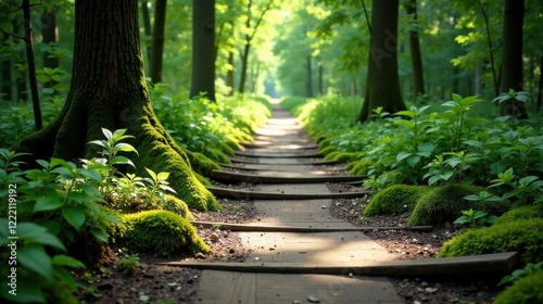 Sunlit Woodland Path A Serene Walk Through Lush Greenery and Mossy Trees