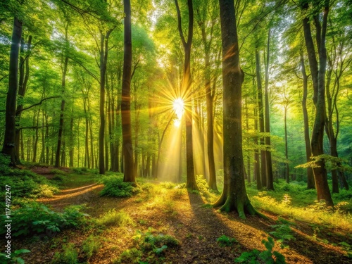Sunlit woodland scene: magical sunlight filters through trees, illuminating a path.