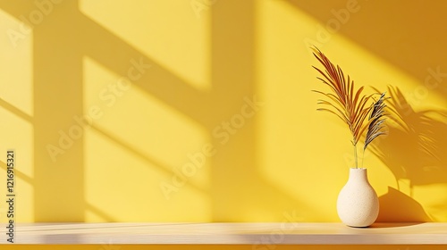 Sunlit Yellow Wall with Minimalist Palm Branch in Vase
