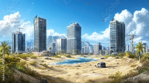 Sunny cityscape, futuristic buildings, deserted beach, construction