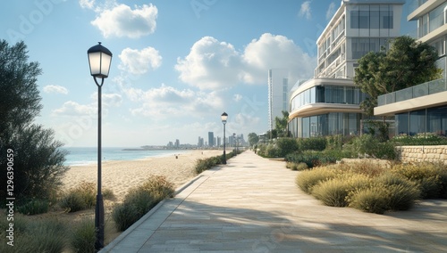 Sunny coastal walkway with modern buildings and beach.
