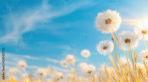 Sunny day, dandelion field, fluffy seeds, blue sky background, nature wallpaper