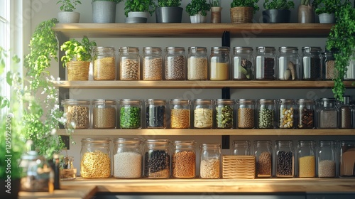 Sunny kitchen pantry with glass jars