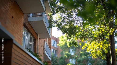 Sunny Urban Apartment with Brick Exterior and Lush Green Trees in the Background : Generative AI